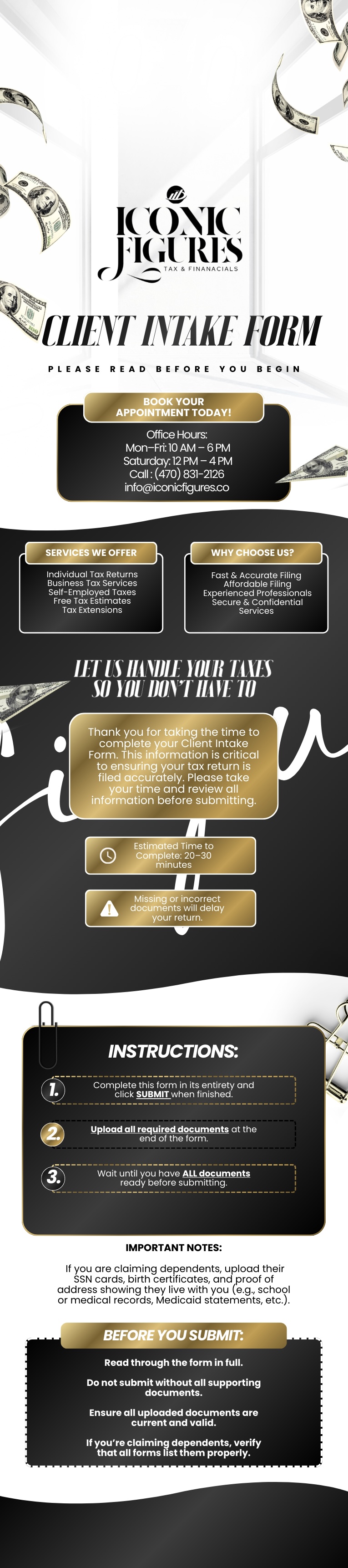 I authorize ICONIC FIGURES TAX & FINANCIAL to collect and securely store my personal and sensitive data, including but not limited to my government-issued identification, Social Security Number (SSN), income documentation, and other tax-related information, for the purpose of preparing and filing my tax return.